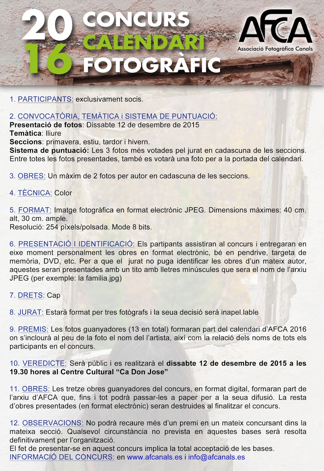 El dia de la recollida de les fotografies és el 12 de desembre de 2015 a partir de les 19:00 fins les 19.30 hores en el Centre Cultural “Ca Don José”. El veredicte serà públic i es farà després de les aportacions fotogràfiques.