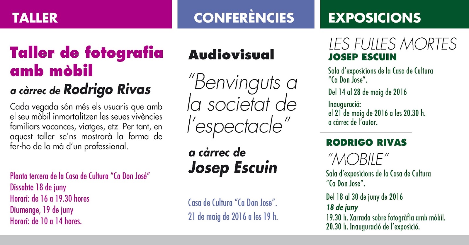 D’altra banda el madrileny Rivas, fotògraf freelance i redactor a mitjans de comunicació, ens donarà un taller sobre la seua forma de treballar amb fotografies realitzades amb mòbil, així com ens mostrarà les seues imatges fetes amb aquest aparell a Nova York.